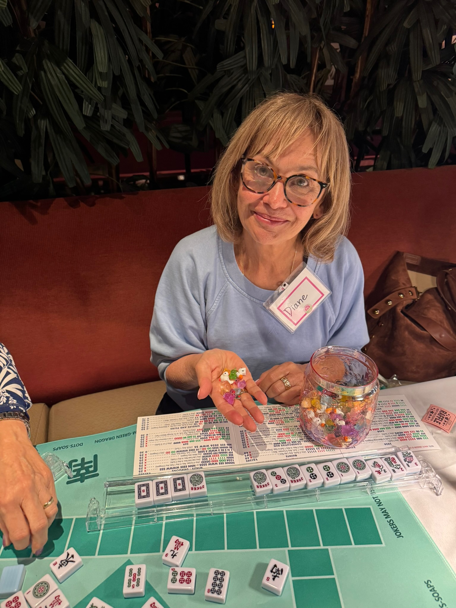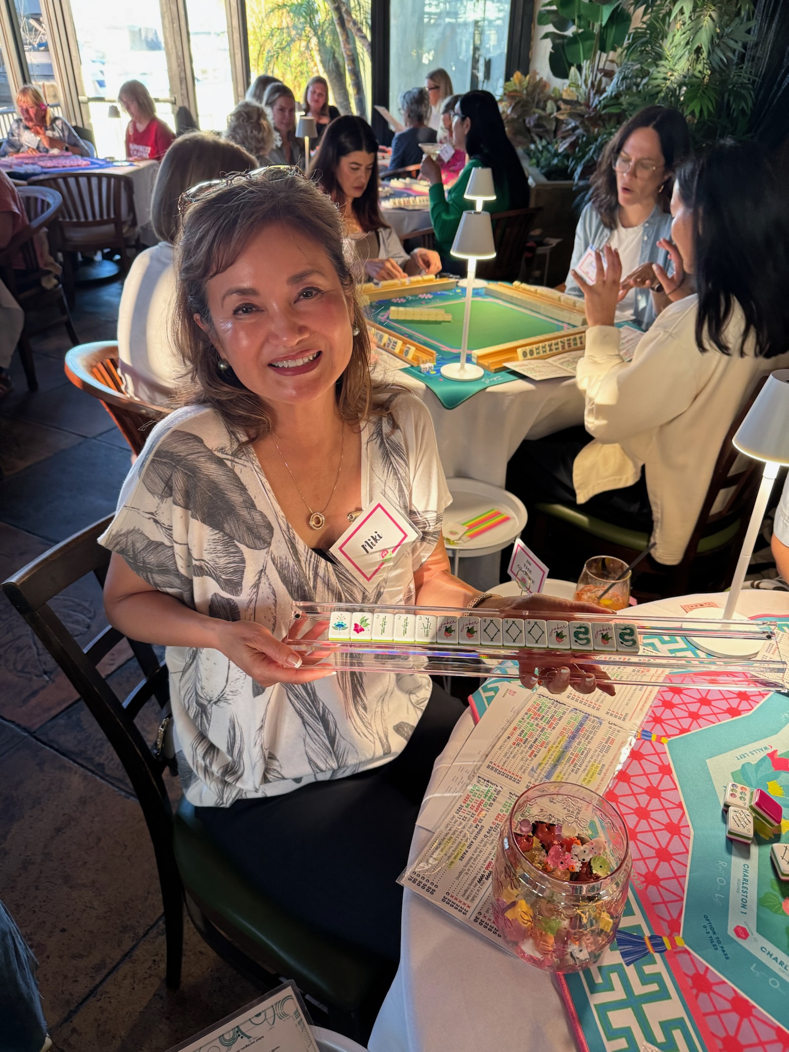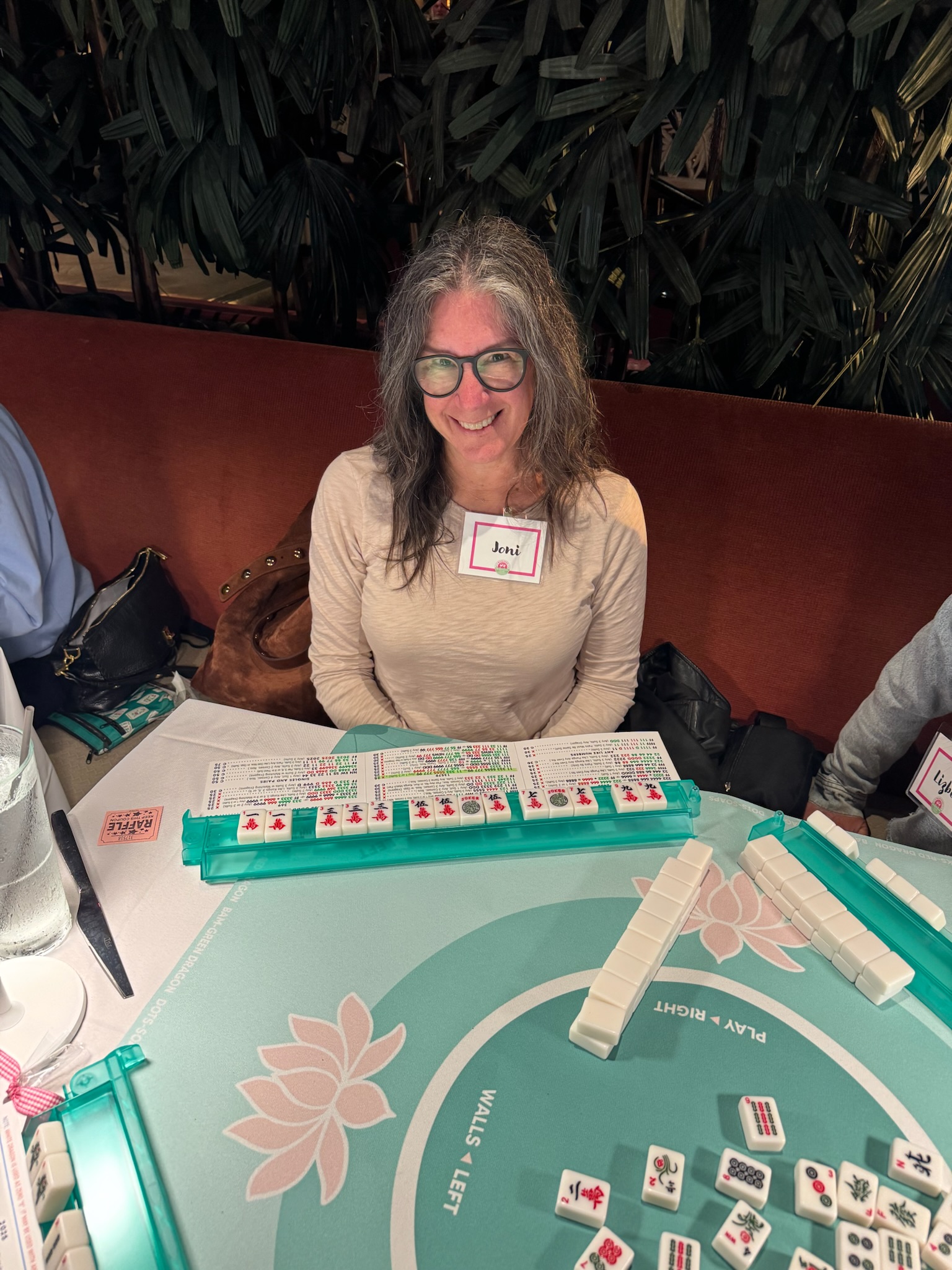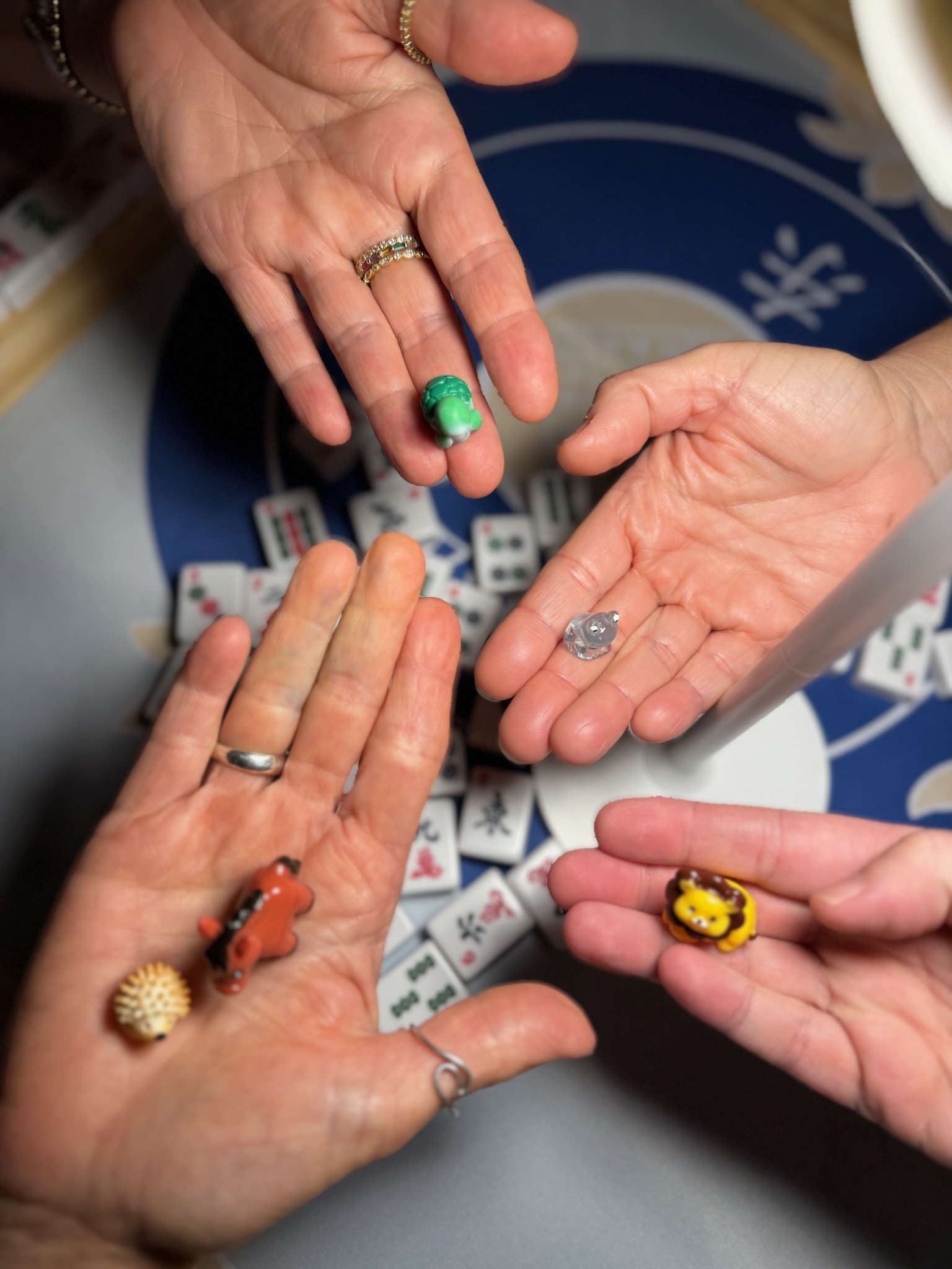We host free open play events thanks to generous local venues that share their space with us. And we put real care into creating a warm, welcoming environment. We bring printed name tags, fresh flowers, Mahjong decor, tablecloths, lamps, side tables, welcome gifts, raffle prizes, and of course, the beloved mini animals you collect when you Mahjong.